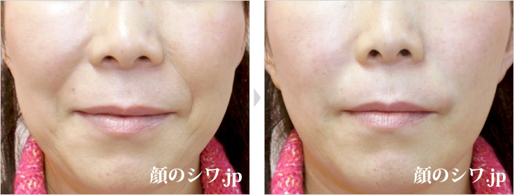 法令線のしわに対しヒアルロン酸注入を行った症例です。深い法令線のシワの深く、老けて不機嫌に見えました。ヒアルロン酸注入により、しわ取りが浅くなりました。ほとんど腫れがなく、家族に内緒で、しわ取りができました。ヒアルロン酸注入によるしわ取りは、短時間でほとんど腫れることもなく、しわ取りができるということから、人気の若返り治療法です。家族にさえ内緒で、ヒアルロン酸注入できることが人気の秘密のようです。手軽に若返りを考えている方はは相談ください。